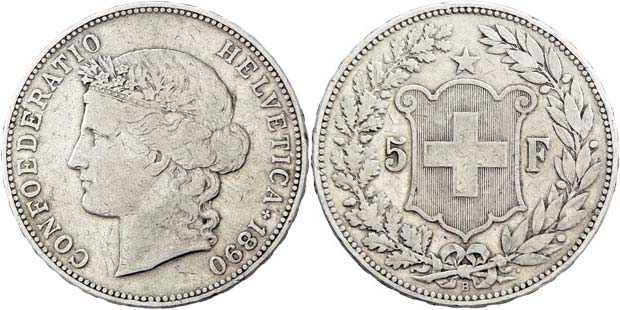5 Frank 1890 B - hlava Helvetie, KM.34, 24.807g, dr.hr., dr.rysky, pěkná patina R!