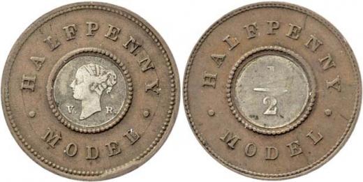 1/2 Penny b.l. - bimetal - zkušební ražba, střed zřejmě stříbrný, mezikruží měděné, KM.neuvádí, 20mm, 1.969g, nedor., pěkná patina R!