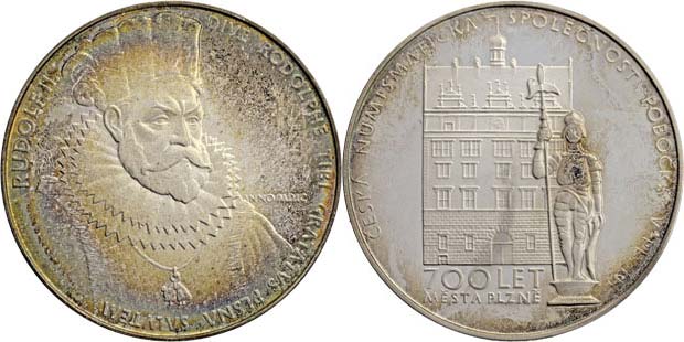 L.Kozák - 700 let Plzně - Rudolf II. 1990 - poprsí částečně zprava, opis / radnice, socha, opis a nápis, Ag 900, 60mm, 109.451g, FM.10 (25 ks !), etue, patina