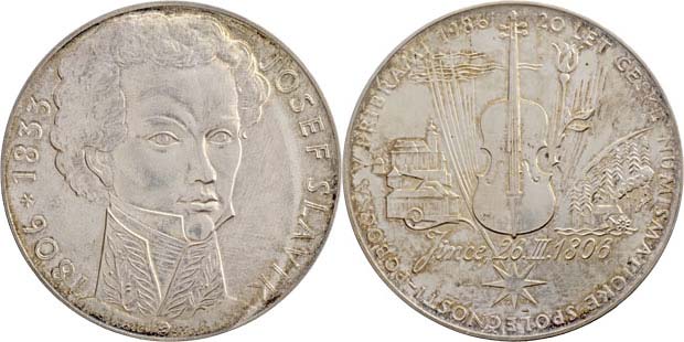 Kozák - houslista Josef Slavík 1986 - poprsí zprava, opis/ housle, budovy v Jincích, hvězda, opis a nápis, Sign., patin.Ag 60mm, 106.673g, BK.6A, vl.rysky, etue