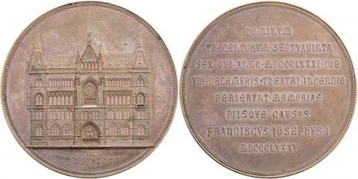 Na paměť 376 lidí zemřelých při požáru divadla 1885 - průčelí divadla, ratolest / 8-řádkový nápis, Sign., měď 60 mm, nep.hr., nep.rysky, krásná patina, téměř