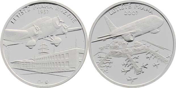 Letiště Praha Ruzyně - 70.výročí založení 2007 - stará budova, letadlo, opis / nové budovy, letadlo, nápis, Sign., Ag999, 34mm, 16.193g, kapsle, etue