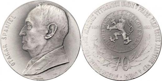 Otakar Španiel - AR medaile na 70.narozeniny 1951 - poprsí zprava, opis / návrh mince, "70", ratolesti, vročení, opis, Sign., patin. Ag987, 60mm, 97.771g R!