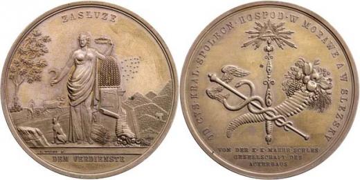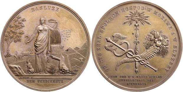 Hospodářská společnost pro Moravu a Slezsko b.l. - stojící Ceres se symboly úrody, nápis / symboly moci a bohatství, písmo, Sign., bronz 62 mm, krásná patina
