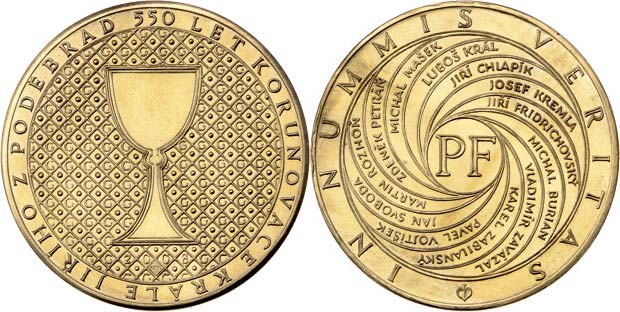 PF 2008 - kalich na iniciálách Jiřího z Poděbrad / v paprscích jména vydavatelů, velké "PF" a opis, Sign., mosaz 30mm, 11.614g, patina R!