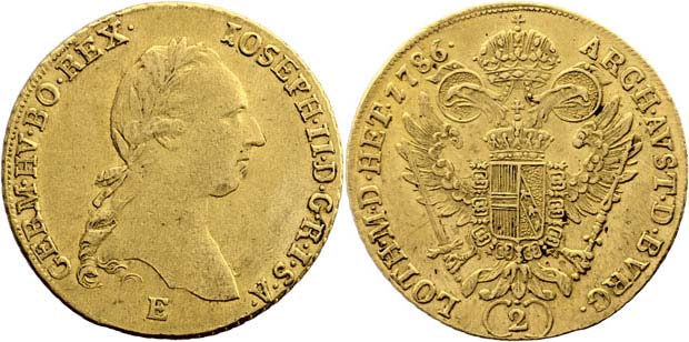 2 Dukát 1786 E, Karlovský Bělehrad, P.17, KM.2088, 6.978g, nep.hr., nep.rysky, pěkná patina, téměř R!