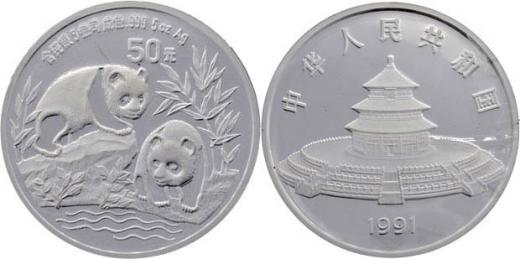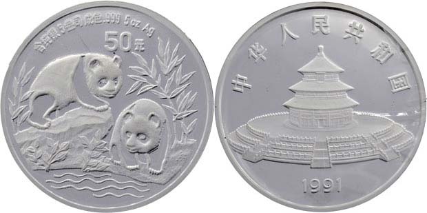 50 Yuan (5 uncí Ag) 1991 - pandy, KM.373 (pouze 5.000 ks), kapsle a zatavená folie