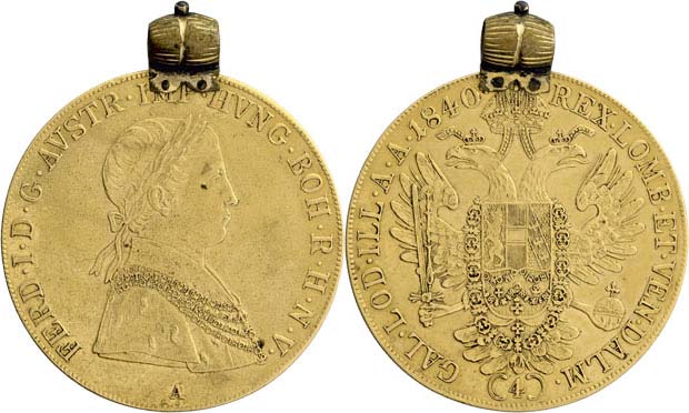 4 Dukát 1840 A, Vídeň, s dobovým soudkovitým ouškem, celková hmotn. 14.521g, dr.hr., dr.rysky, patina R!