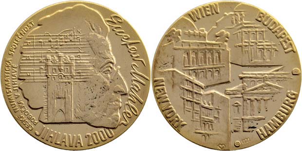 Vitanovský - 140 let narození Gustava Mahlera 2000 - hlava zprava, notový zápis, opis / průčelí operních budov, opis, Sign., Au986, 27mm, 12.627g, 36ks RR!