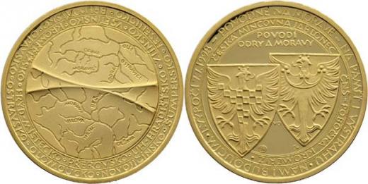 Oppl - 1.výročí povodní na Moravě 7.7.1998 - znaky Moravy a Slezska, nápis a 2 opisy / mapa a 2 opisy, Sign., Au986, 29mm, 15.573g, 100ks, etue, certif. RR!