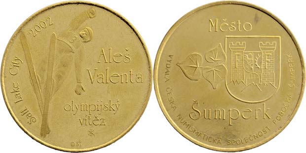 Štětina - olympijský vítěz Aleš Valenta 2002 - lyžař akrobat při skoku, písmo / znak města, lipové lístky, písmo, Sign., Au999, 40mm, 35.667g, vl.rys., etue RR!