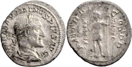 AR Denár, Rv:"P.M.TR.P.II.COS.P.P.", stojící císař se dvěma standartami, S.2242, RIC.3 - mincovna Řím - ražba z roku 236, mírně exc., pěkná patina