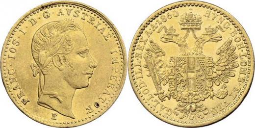 Dukát 1860 E, 3.479g, dr.hr., nep.rysky, patina