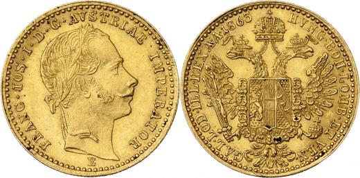 Dukát 1863 E, 3.493g, nep.hr., nep.rysky, patina, téměř
