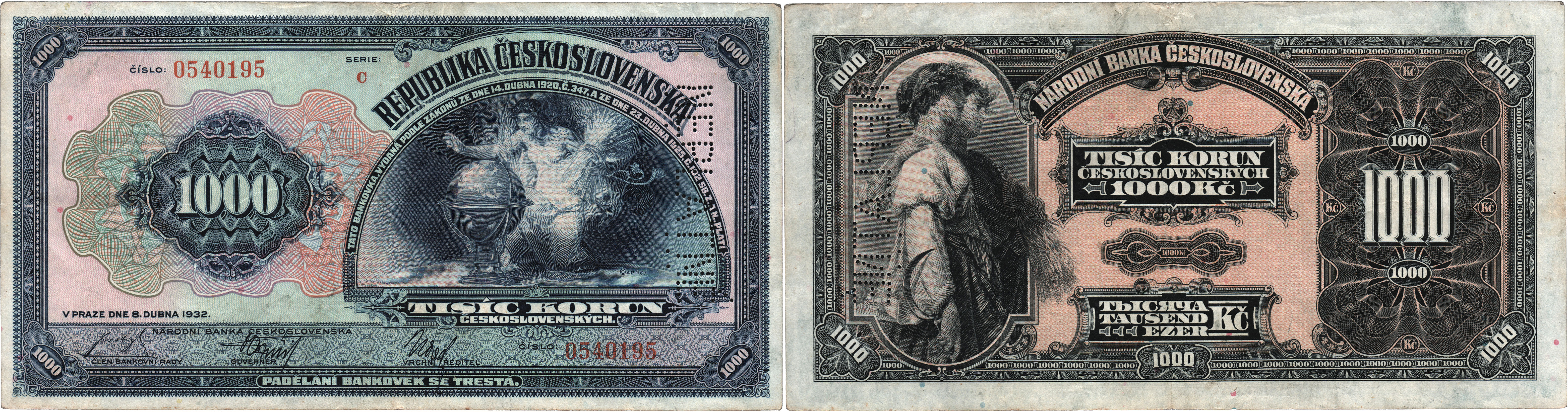 1000 Koruna 1932, série C, BHK.26 - svislá perforace "NEPLATNÉ", bankovní vzor, Kar.20c