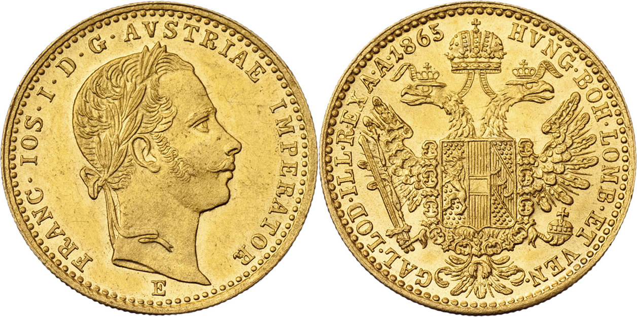 Dukát 1865 E, 3.480g, nep.hr., nep.rysky
