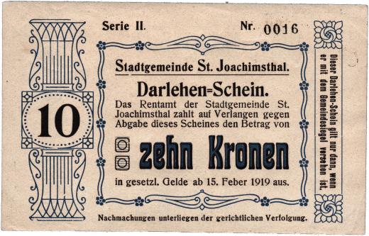 St.Joachimsthal (Jáchymov) - 10 Kor.1919, D-H.183/1.4 - série II., na reversu otisk další poukázky