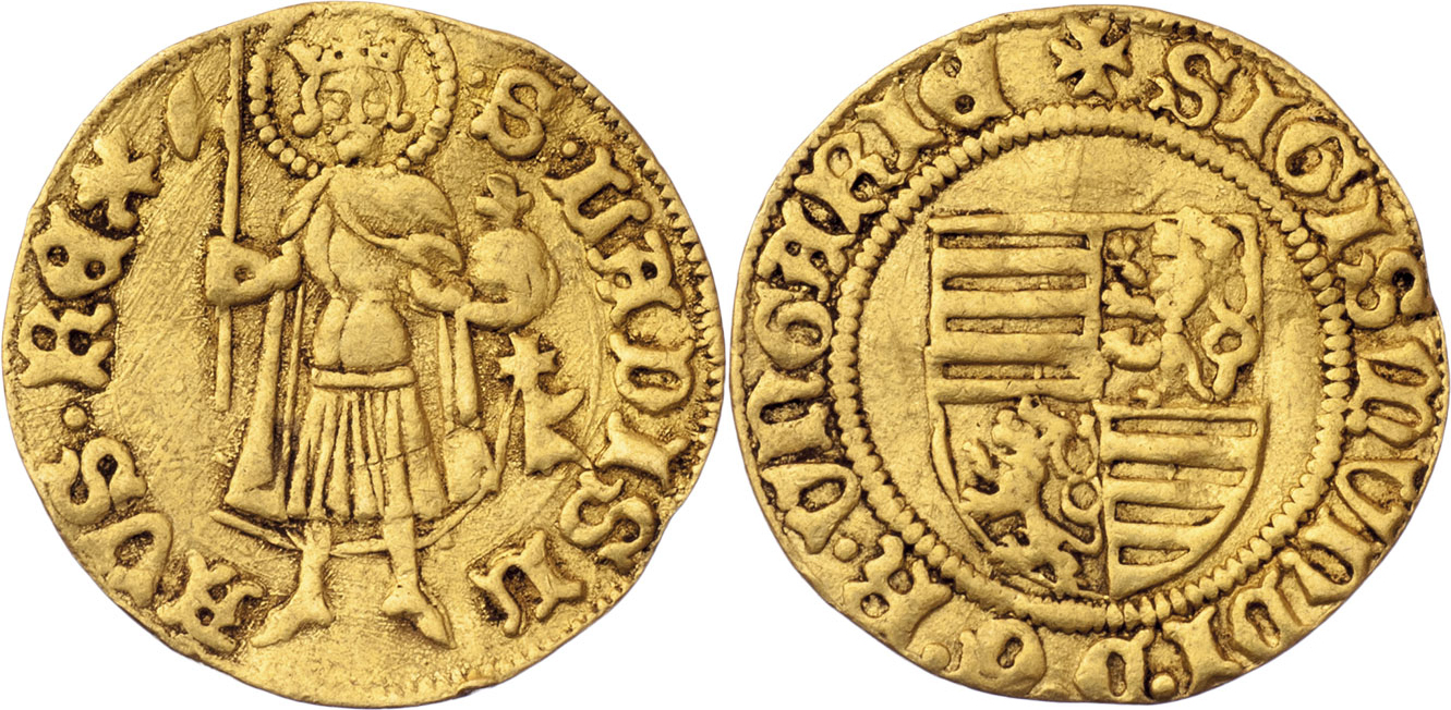 Dukát (1411) bz-K/kříž, Buda-Ulrik Kamerer, sv.Ladislav, opis / znak se dvěma českými lvy, opis, Len.18/3, Pohl.D2-8, Husz.573, 3.387g, zvlněný, pat.