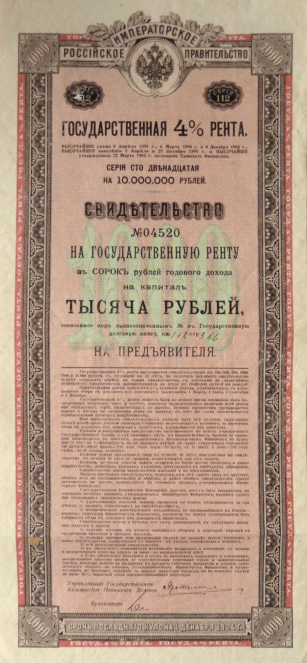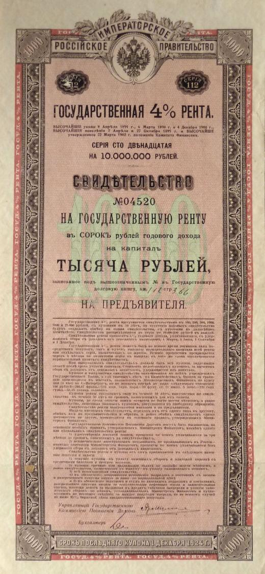 Rusko (1894) - Státní 4% hospodářská renta na 1000 Rublů, číslo 04520, titulní list a 19 kupónů (10 Rublů), používaných jako náhradní platidla
