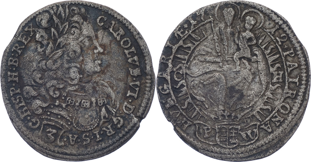3 Krejcar 1712 CH-PW, Bratislava-Wödrödi, Hal.561, Husz.1629, 1.716g, krajový střížek, nep.exc., nep.nedor., pěkná patina R!