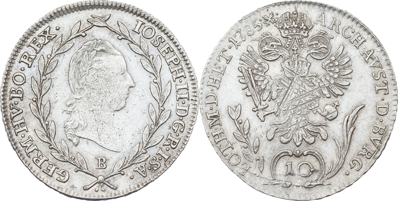 10 Krejcar 1785 B, Husz.1887, P.32, 3.848g, just., nep.vada razidla, nep.hr., nep.rysky, patina