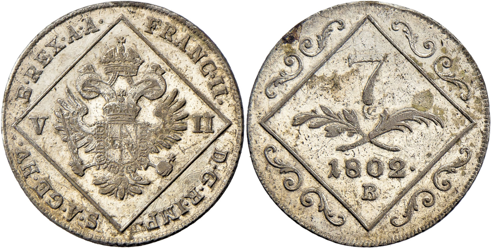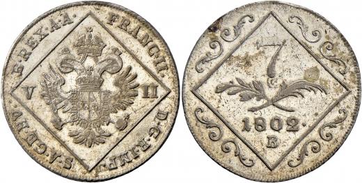 7 Krejcar 1802 B - dobře patrné stopy přeražby, 4.916g, nep.nedor., pěkná patina, téměř