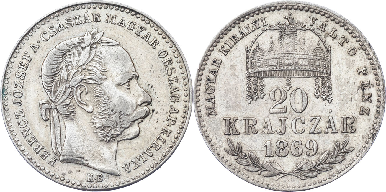 20 Krejcar 1869 KB - dlouhý opis, 2.658g, nep.hr., nep.rysky, pěkná patina R!