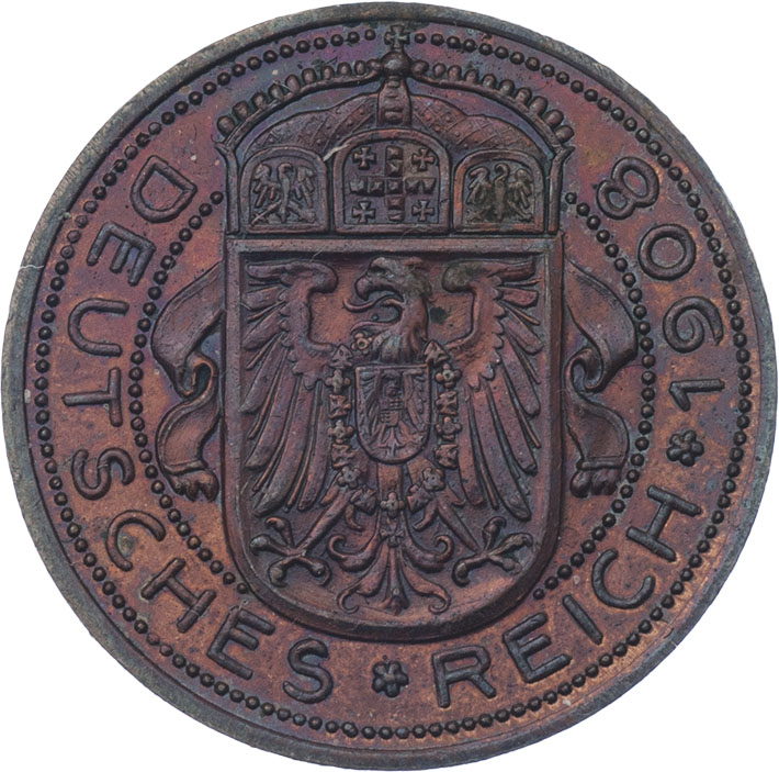 25 Fenik 1908 D - zkušební ražba - císařský znak ve štítu / nominál, rosetky, nápis, Nesign.(Götz), měď 23 mm, krásná patina