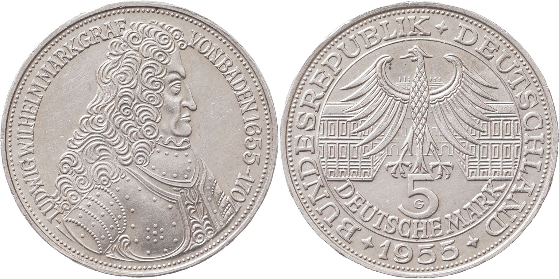 5 Marka 1955 G - Ludwig von Baden, KM.115, 11.376g, dr.hr., dr.rysky, téměř RR!