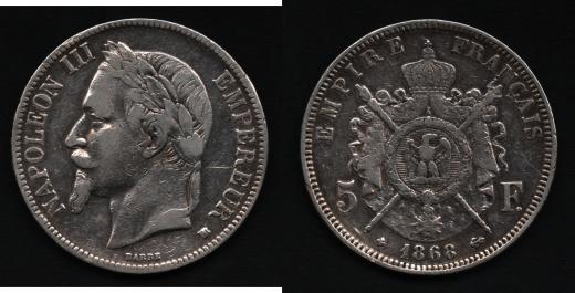 5 Frank 1868 BB, Strasbourgh, KM.799.2, 24.685g, dr.hr., vlas.škr., rysky, patina