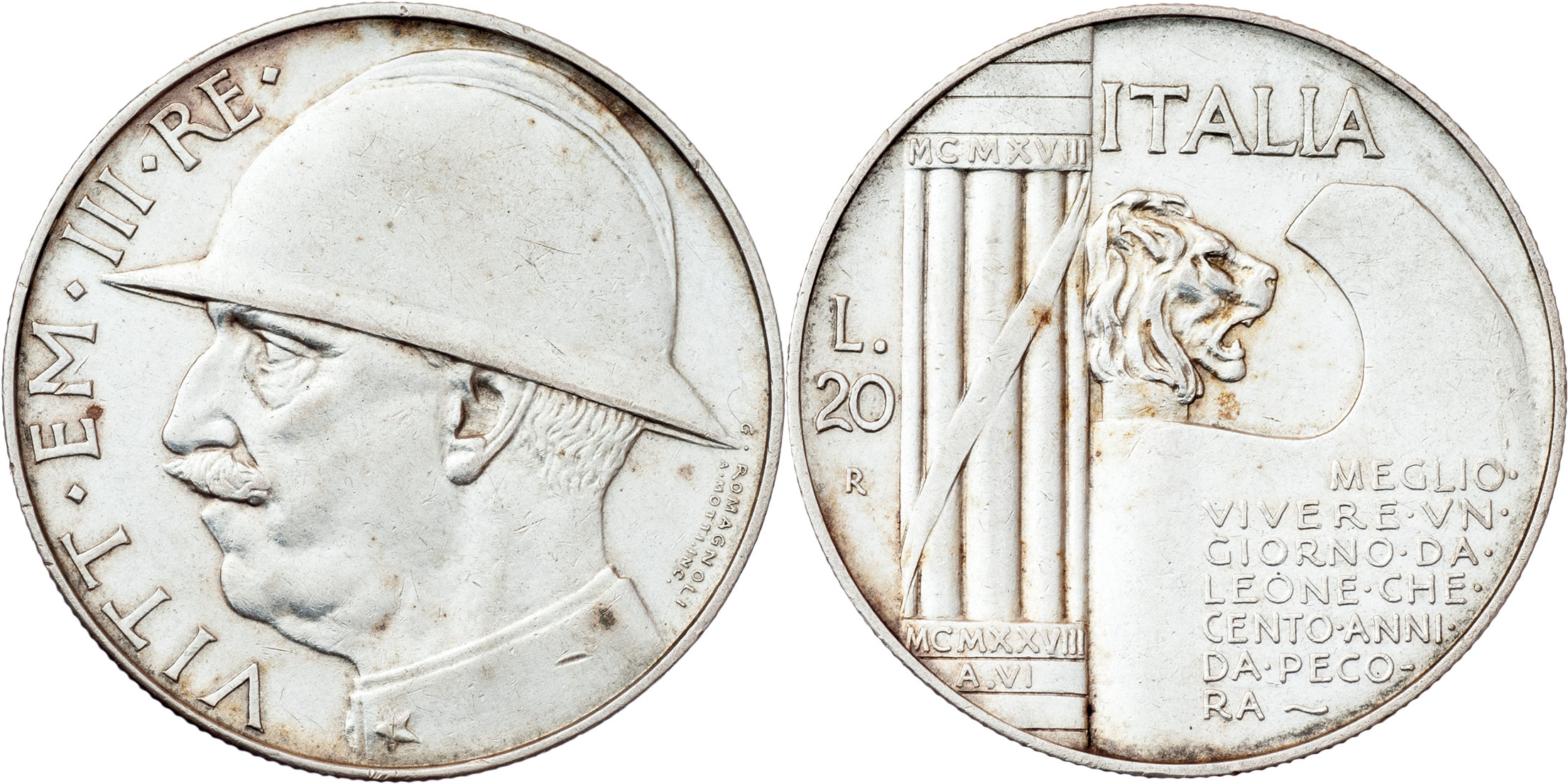 20 Lira 1928 - rok VI. - král v přilbě zleva, KM.70, 20.010g, nep.hr., dr.rysky, patina R!