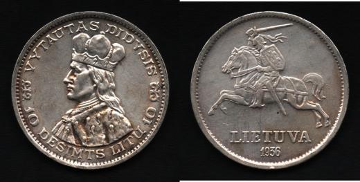 10 Litu 1936 - Didysis, KM.83, 17.993g, hr., nep.rysky, patina