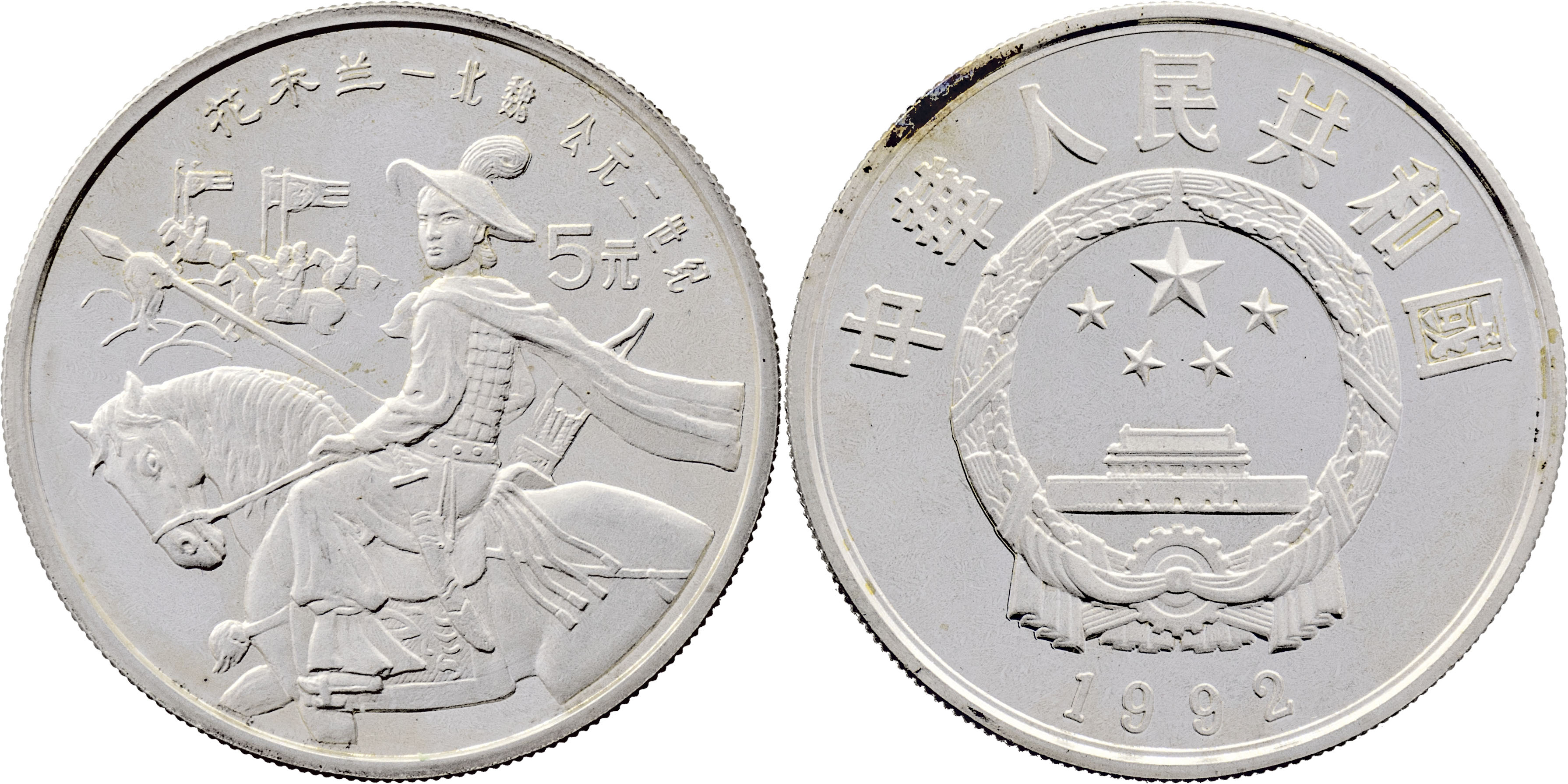 5 Yuan 1992 - Mulan Hua na koni, Y.551 (pouze 7.000 ks), kapsle, skvrnky