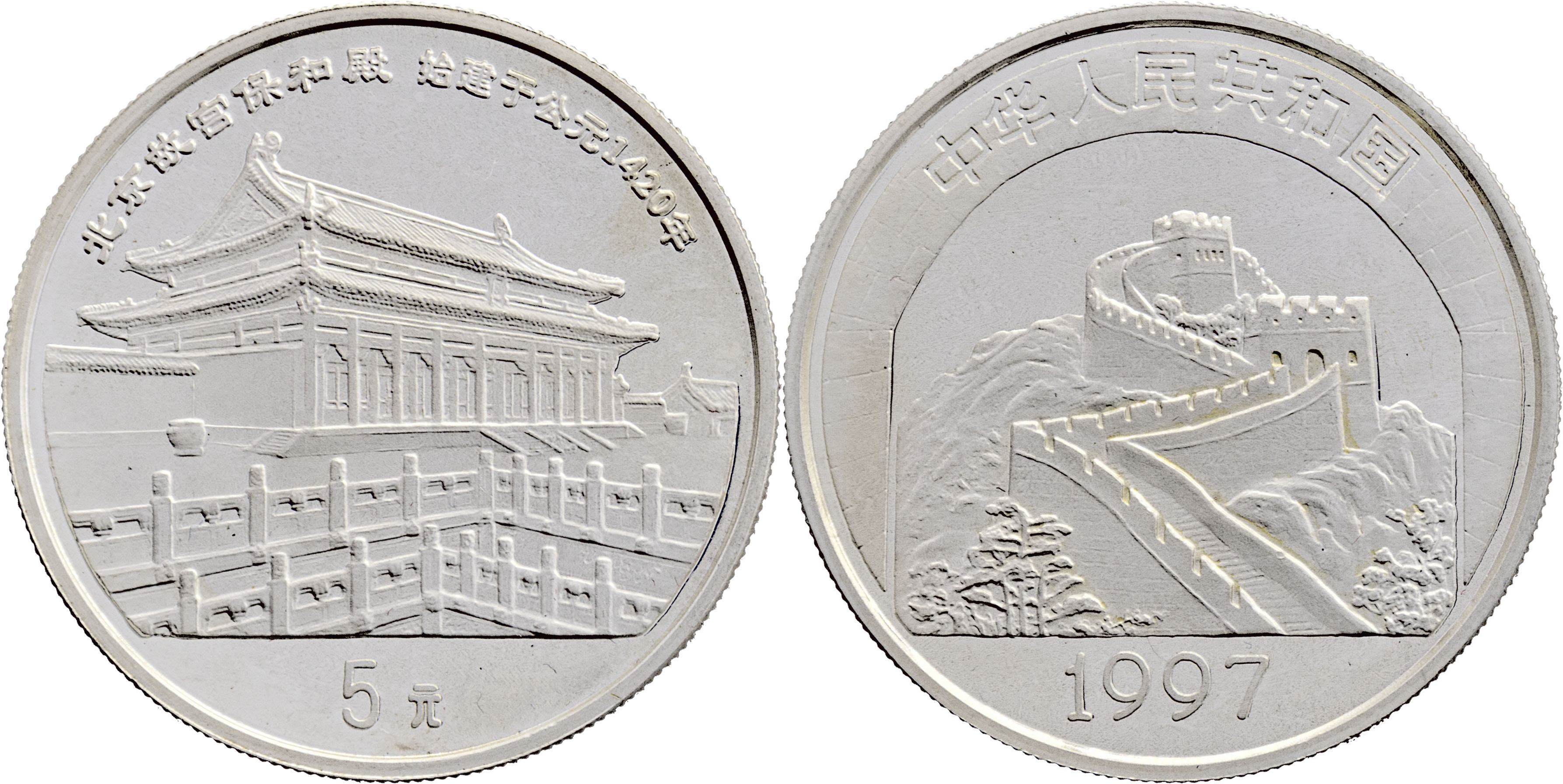 5 Yuan 1997 - Velká zeď /palác, Y.1190 (pouze 35.000 ks), kapsle