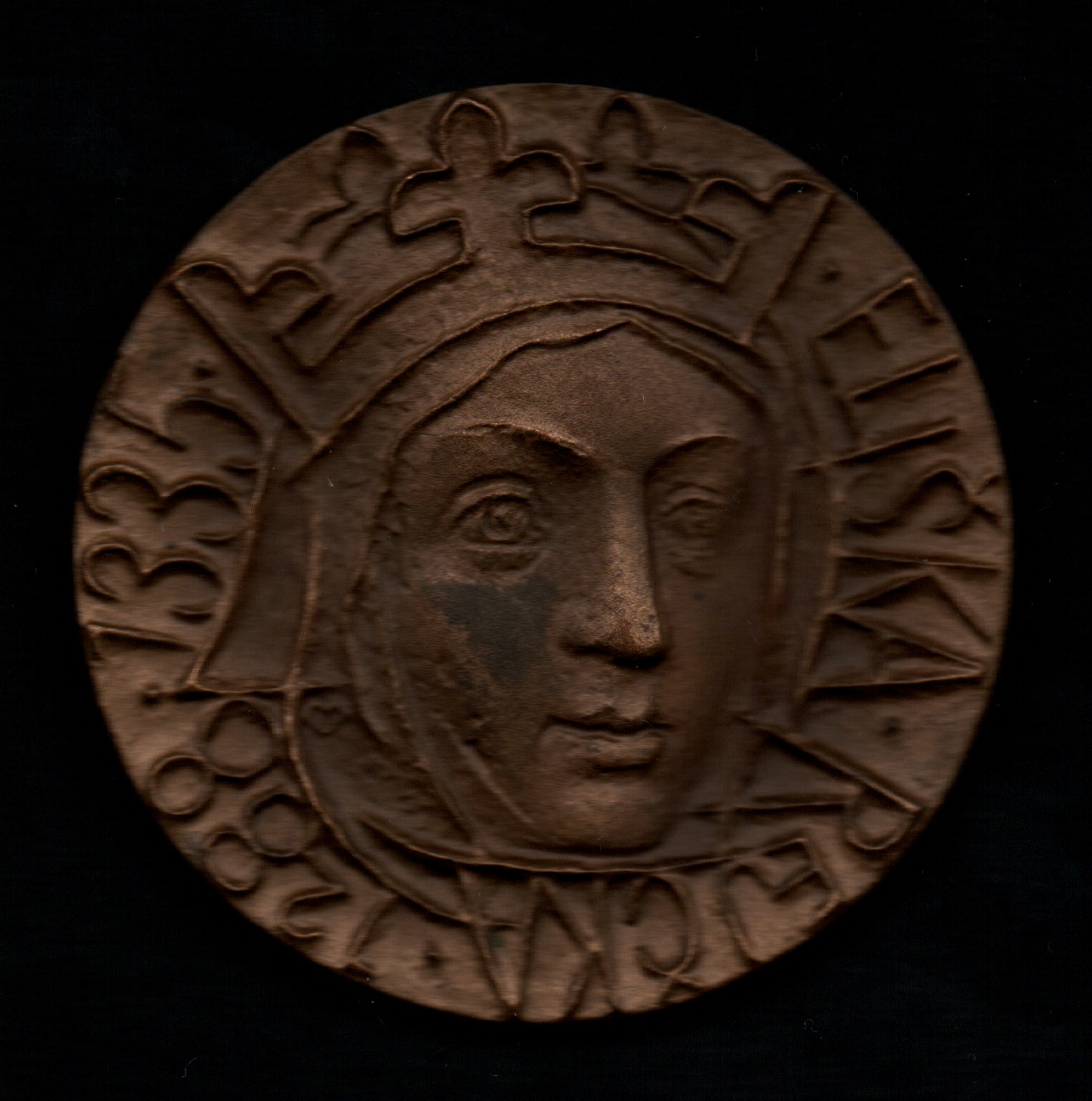 Vitanovský - Eliška Rejčka - 650 let úmrtí 1985 - hlava se závojem a královskou korunou, vročení, opis / znak a nápis, Sign., patinovaný bronz 50 mm, BK.8A