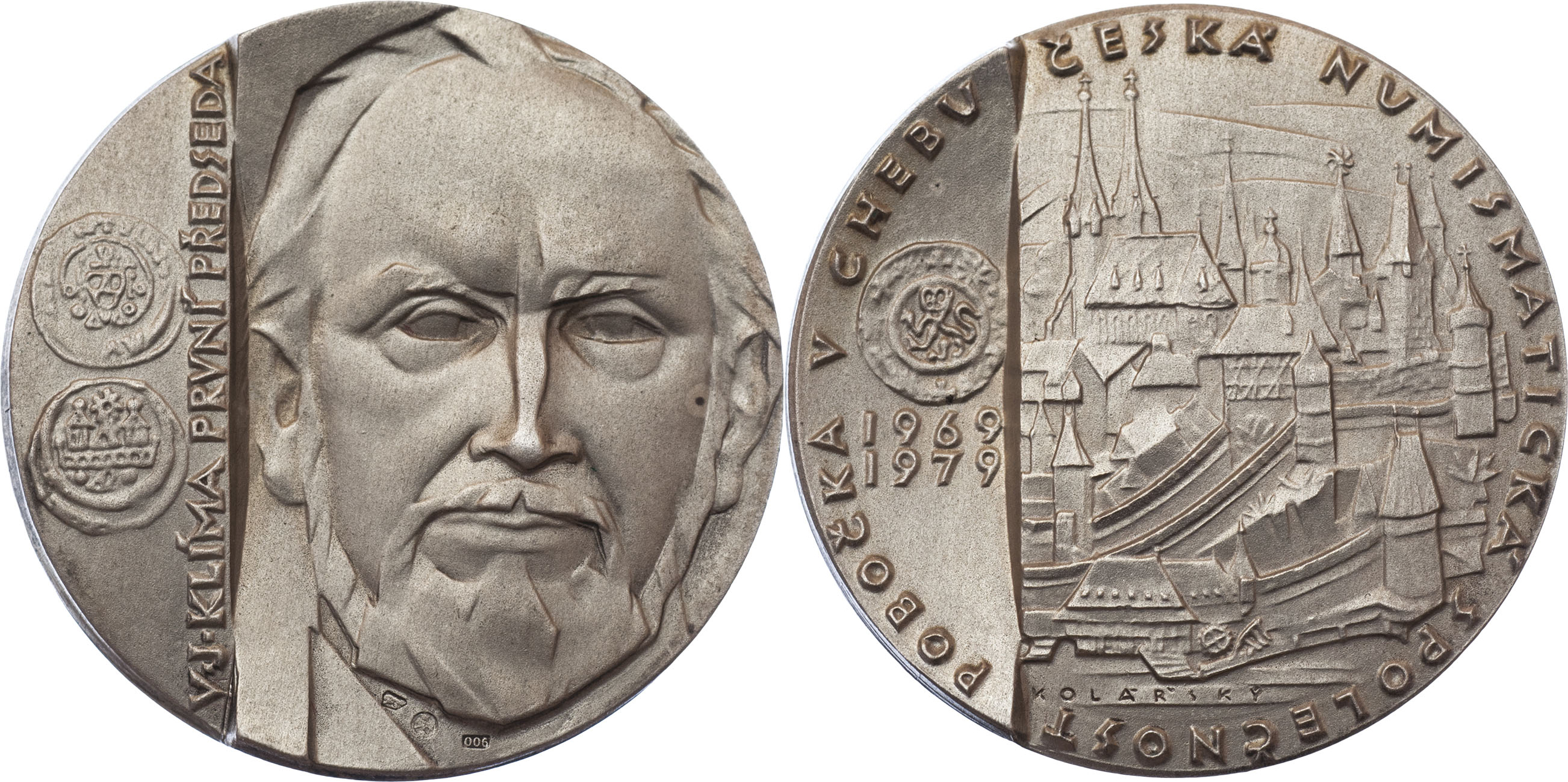 Kolářský - 10 let pobočky 1979 - portrét V.Klímy zpředu, mince, nápis / pohled na město, mince, opis, Sign., Punc., patin.Ag, 40mm, 59.507g, BK.5 (85ks) R!