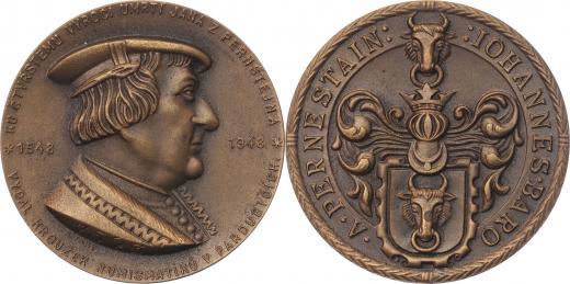 Jarý - Jan z Pernštejna - 400.výročí úmrtí 1948 - poprsí zprava, vročení, opis / rodový znak a latinský opis, Sign., patinovaný bronz 40 mm, BK.3