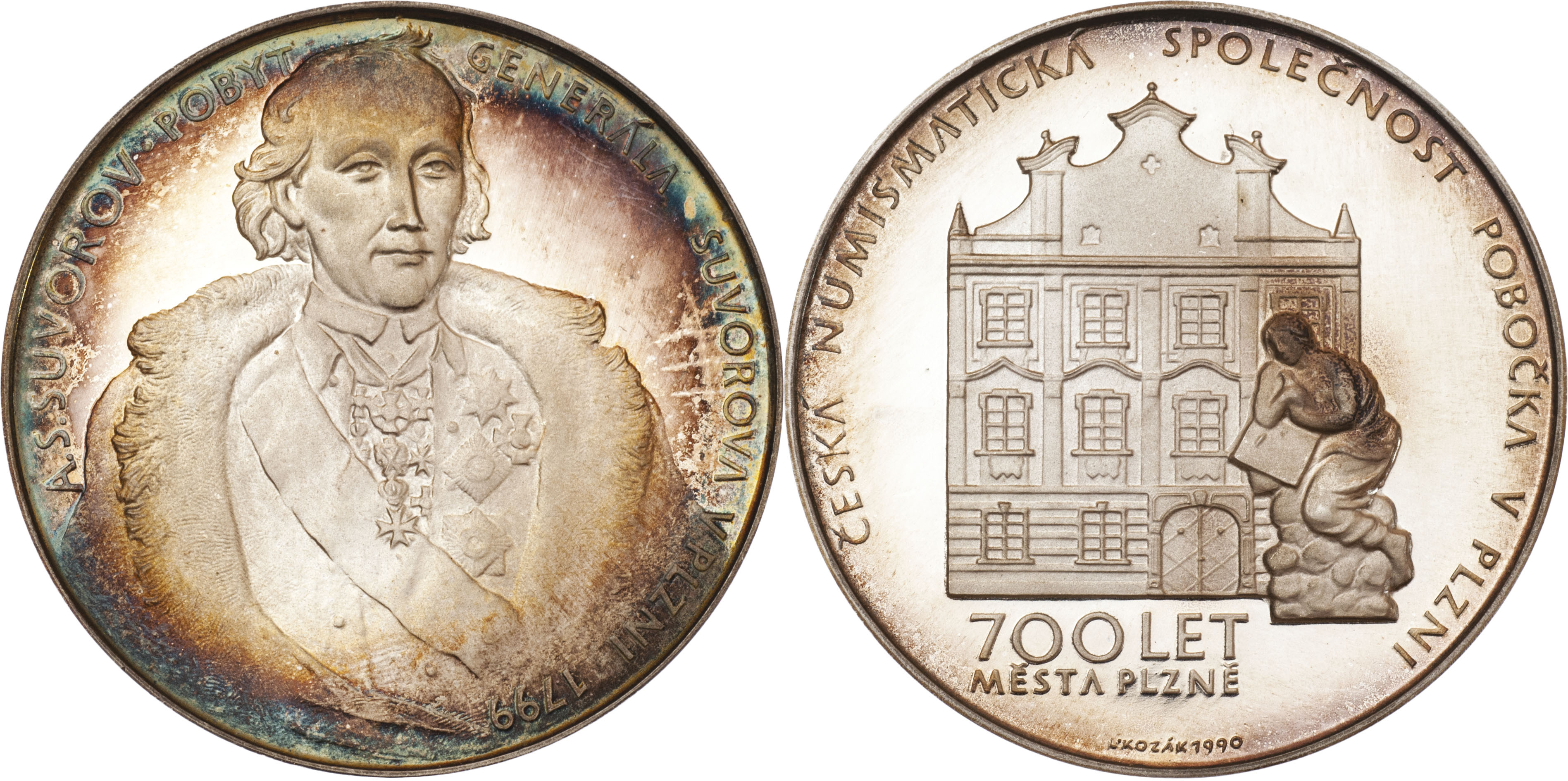 L.Kozák - 700 let Plzně - Suvorov 1990 - poprsí zprava, opis / dům Augustonů, socha, písmo, Sign., Ag900, 60mm, 112.003g, FM.12 (25ks), patina, etue RR!