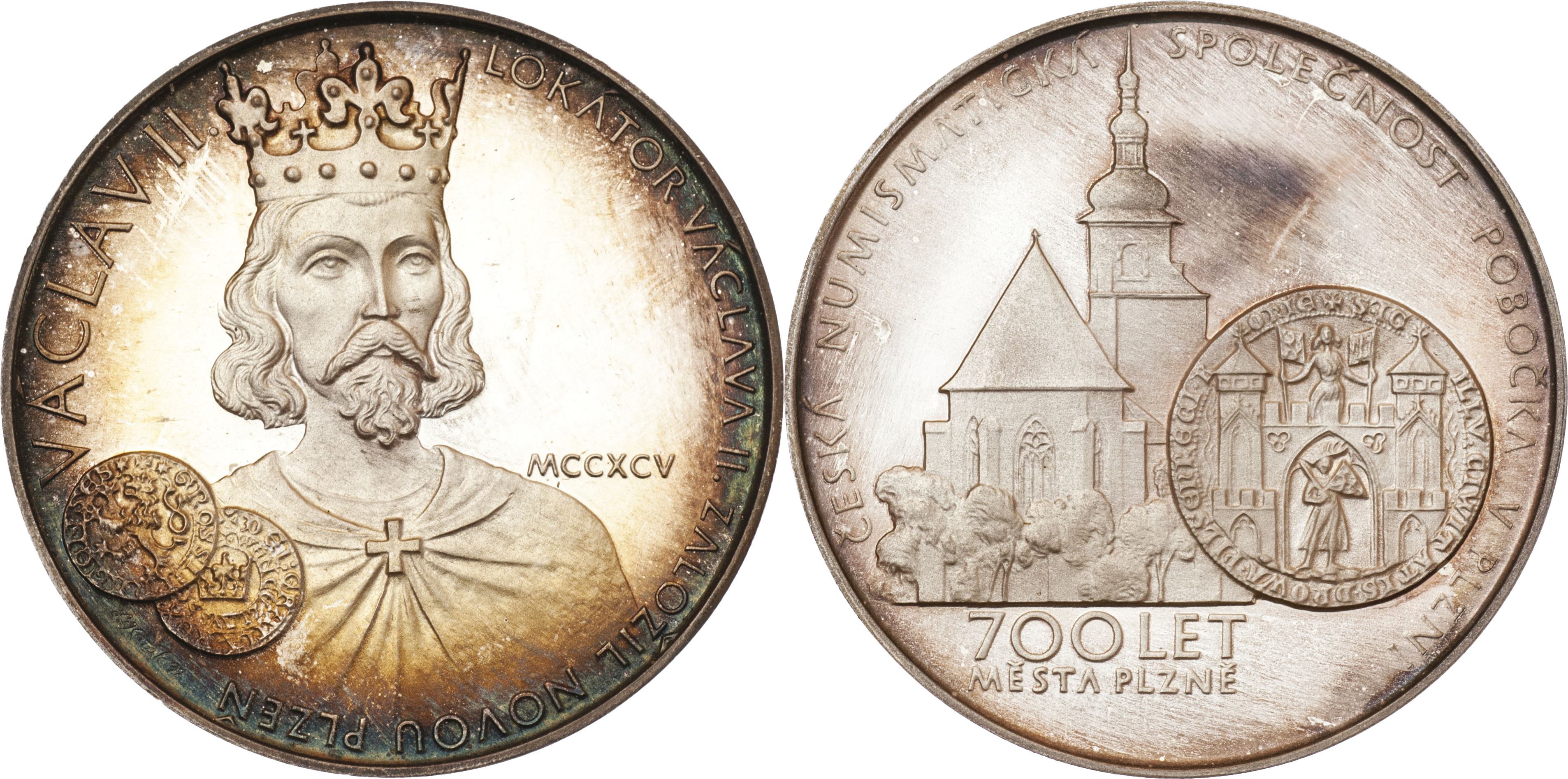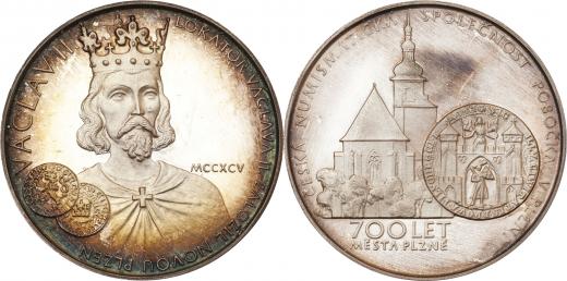 L.Kozák - 700 let Plzně - Václav II. 1992 - poprsí zpředu, groše, opis / kostel, pečeť, písmo, Sign., Ag900, 60mm, 105.880g, FM.16 (25ks), patina, etue RR!