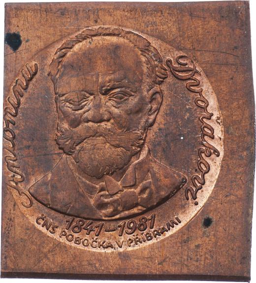 Peter - osmdesát let Rusalky Antonína Dvořáka 1981 - poprsí zpředu, opis / mlžná postava u jezera, zámek Vysoká a písmo, Cu klipa 40x45 mm, zkušeb.ražba RR!