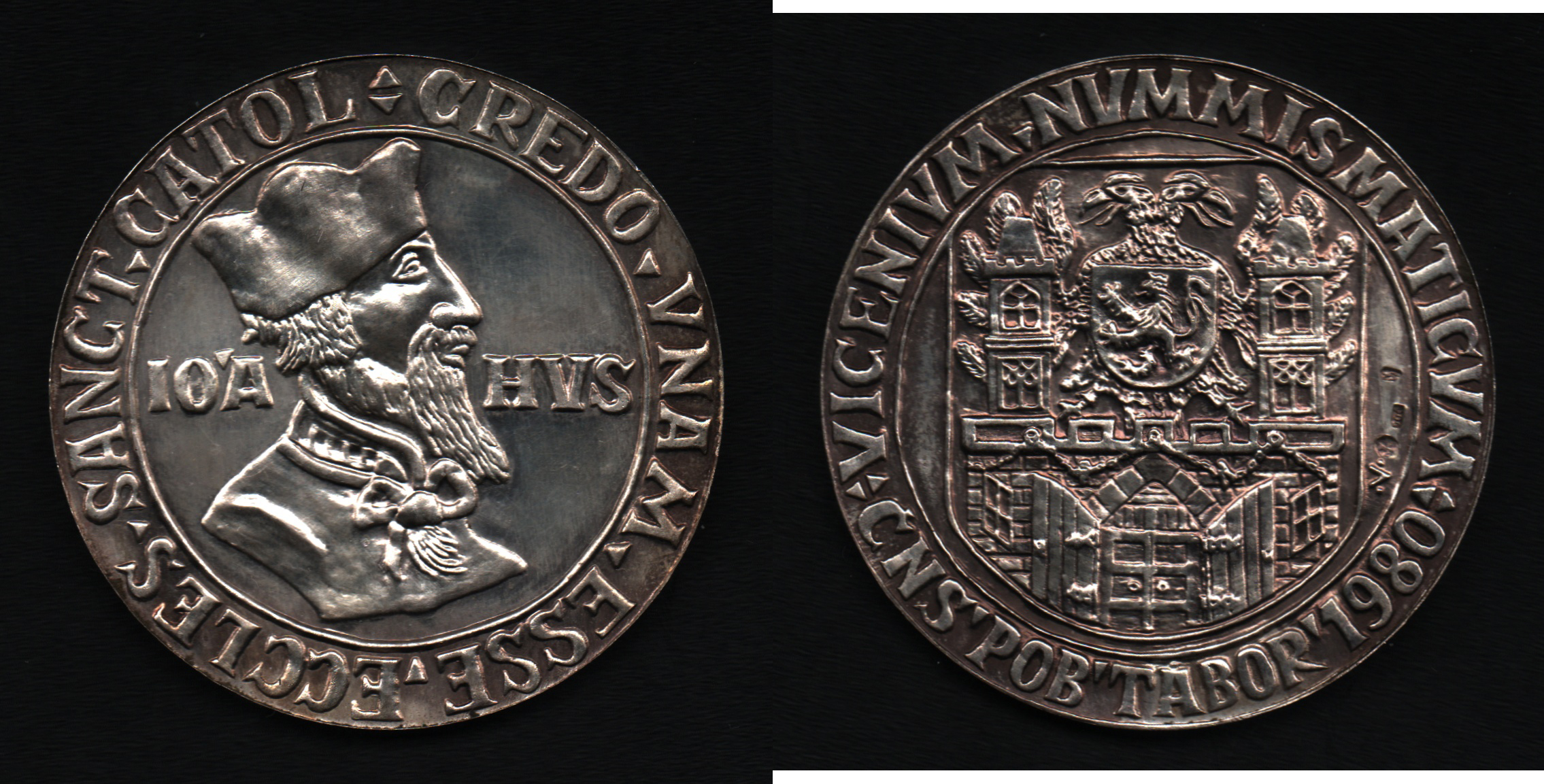 Vančura - 20 let organizované numismatiky 1980 - mistr Jan Hus zprava, nápis a opis / znak Tábora, opis, Sign., Punc., Ag900, 42mm, 27.526g, BK.2
