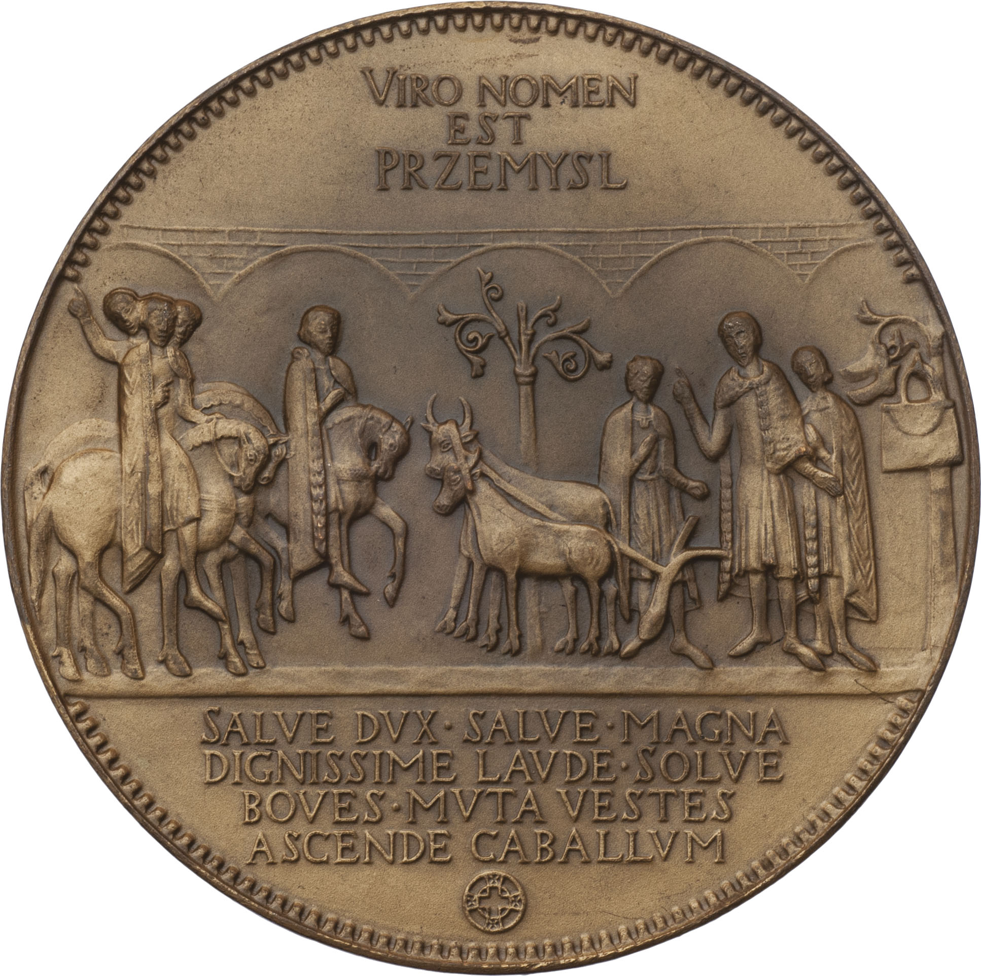 Znojmo - obnovení kaple svaté Kateřiny 1949 - dvě postavy nad rotundou, opis/ povolání knížete Přemysla na trůn, latinský nápis, Sign., patinov.bronz 70 mm