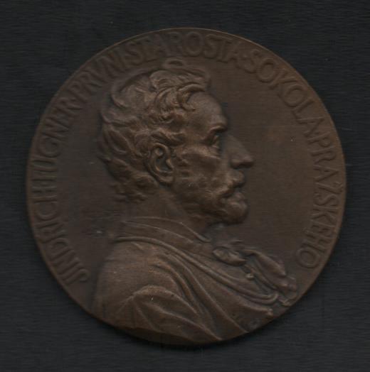 Jindřich Fügner (1822 - 1865) - pamětní medaile 1903 - poprsí zprava, opis / 12-řádkový nápis, Sign., patinovaný bronz 34mm, téměř R!
