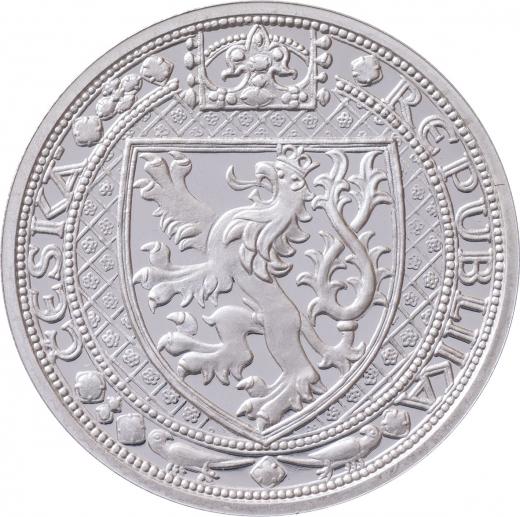 Trůnící Karel IV. mezi dvěma orlicemi, znaky, opis / korunovaný český znak, opis, Sign., Ag999, 40mm, 31.148g (1 unce Ag), na hraně číslo 25, kapsle