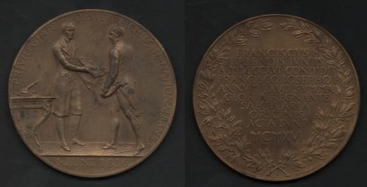 Vídeň - 100 let založení Rakouské národní banky 1916 - císař František předává listinu guvernérovi banky, opis / nápis ve věnci, Sign., bronz 65 mm, skvrnky
