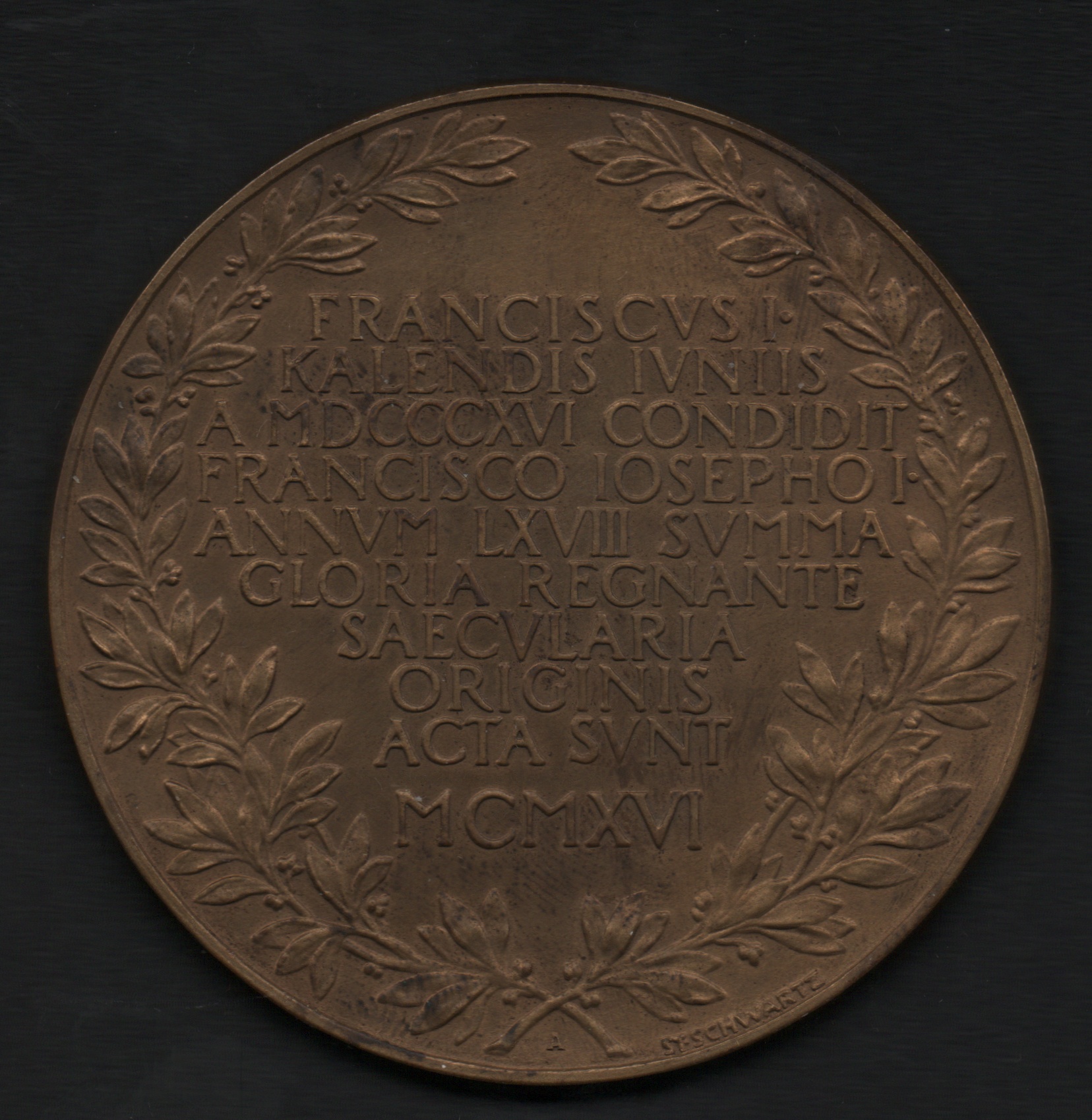 Vídeň - 100 let založení Rakouské národní banky 1916 - císař František předává listinu guvernérovi banky, opis / nápis ve věnci, Sign., bronz 65 mm, skvrnky