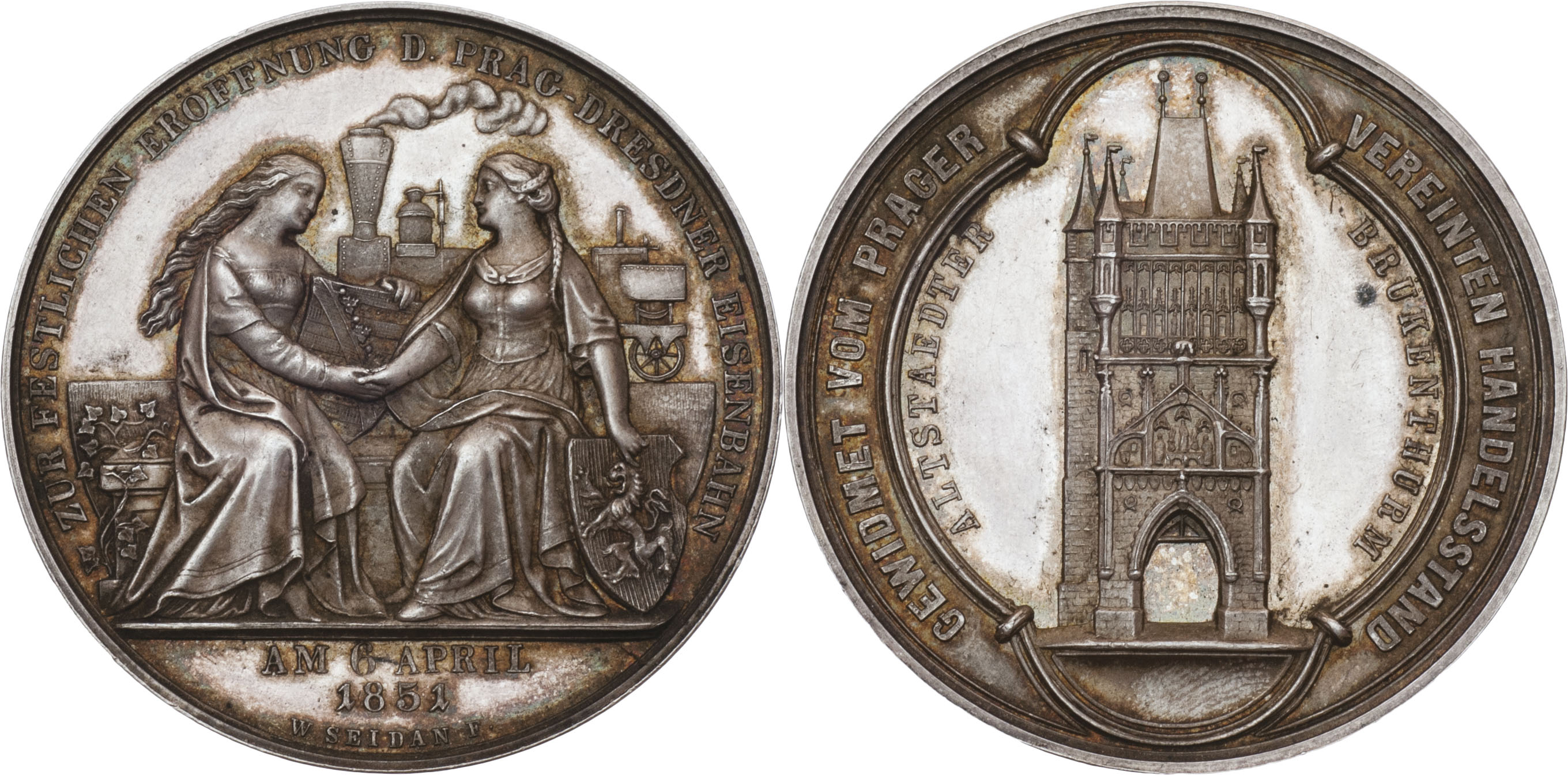 Otev. železnice Praha - Drážďany 6.4.1851 - Bohemia a Saxonia si podávají ruce, lokomotiva, opis a nápis/ Mostec.věž, opisy, Ag 48mm, 52.639g, vl.rys.,pat. RR!