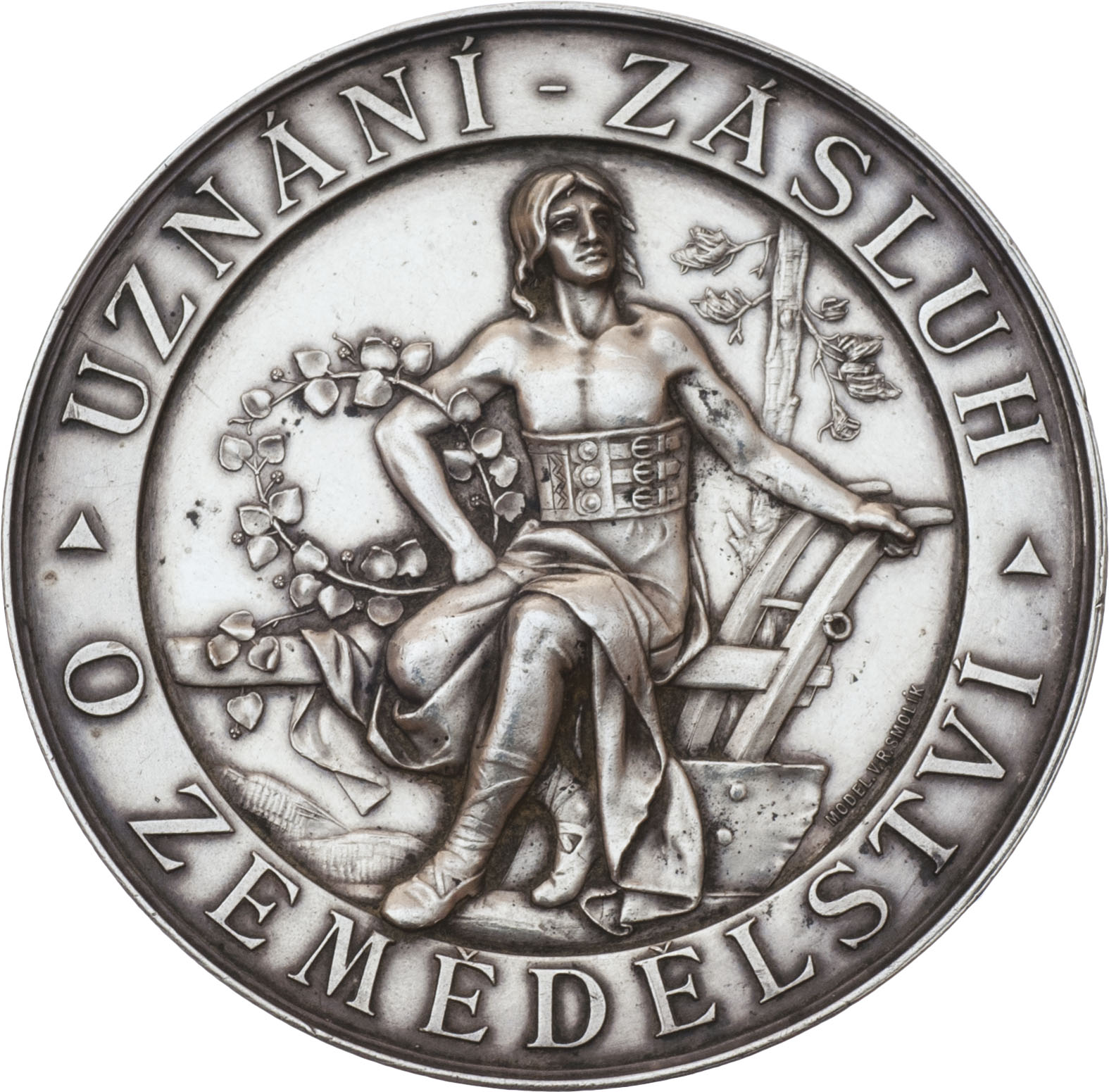 Zeměděl.rada pro Království české - uznání zásluh - Přemysl Oráč sedící na pluhu, lípa, opis/ český znak, nápis a opis, Sign., Ag 55mm, 60.288g, vl.rys., pat.