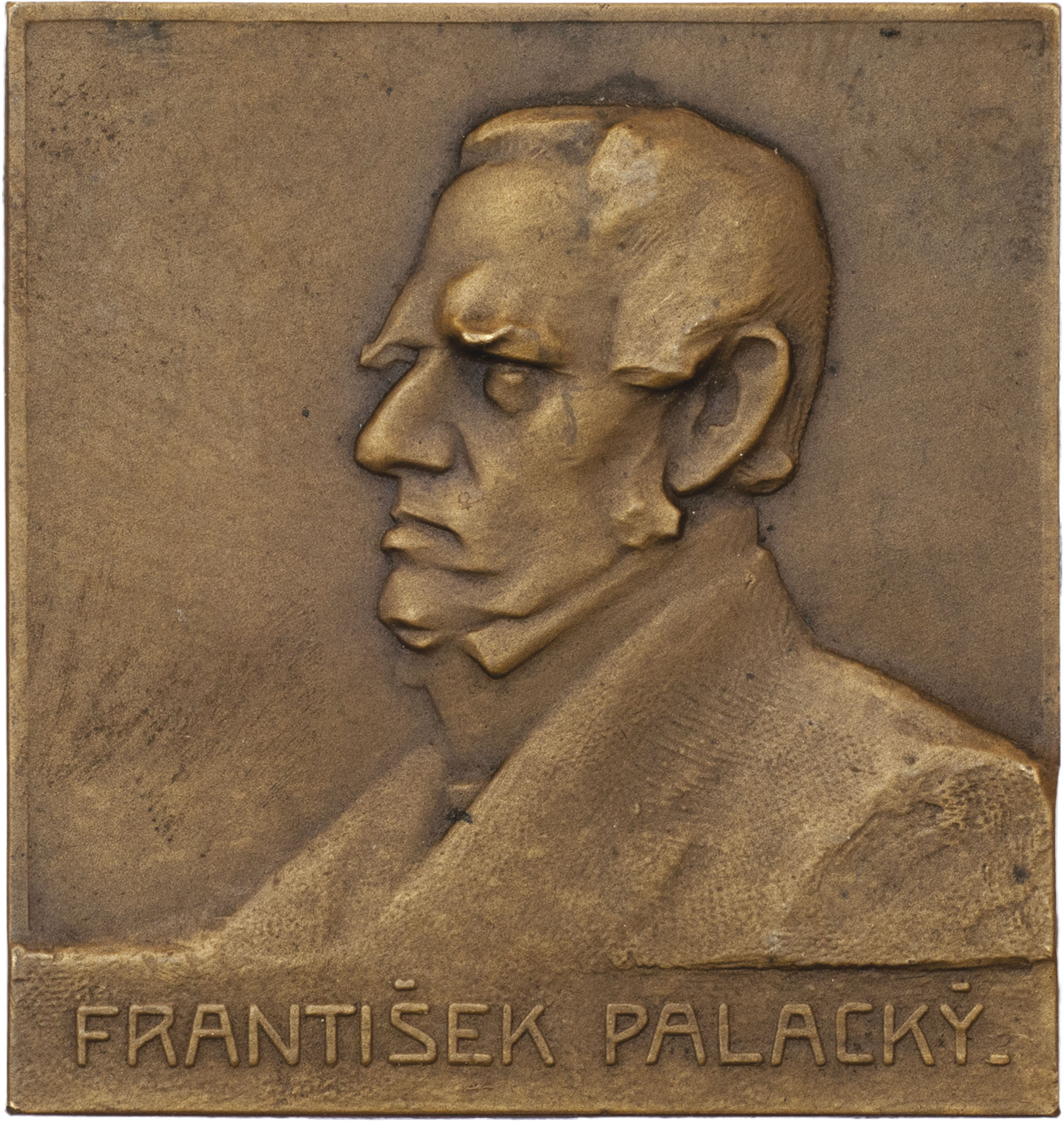 Odhalení pomníku Františka Palackého 1.VII.1912 - poprsí zleva, nápis / pohled na pomník, 2-řádk.nápis, Sign., patinovaný bronz 57x60 mm, téměř