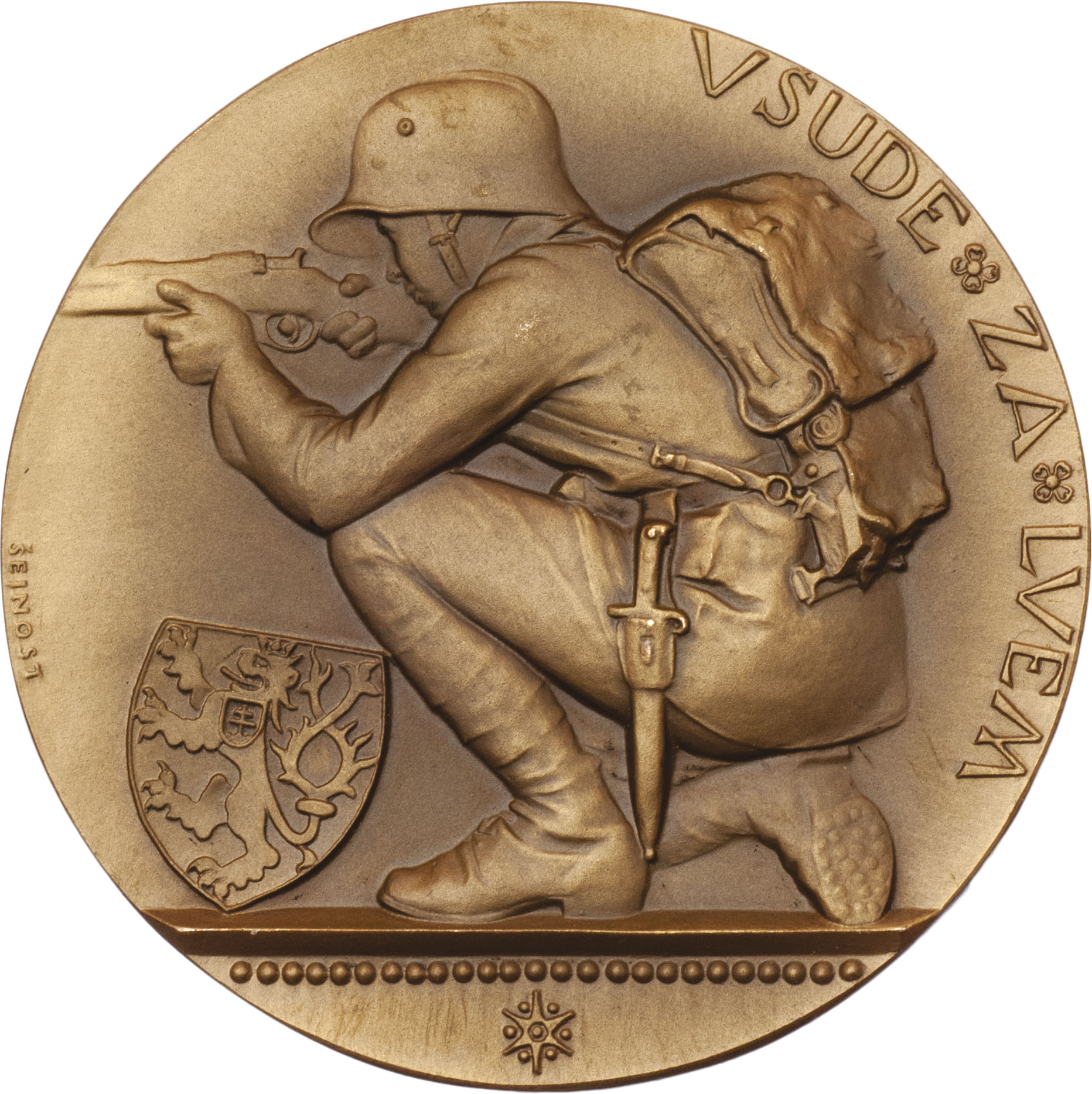 Václav Klofáč - I.ministr národní obrany 1920 - poprsí zprava, opis / klečící voják míří puškou, znak, nápis, Sign., patinov.bronz 59 mm, MZČ.222/41